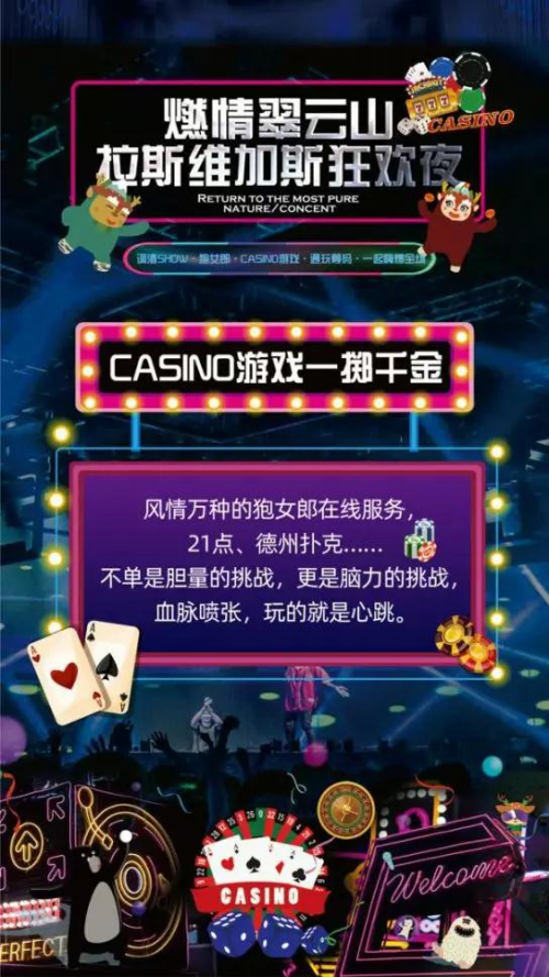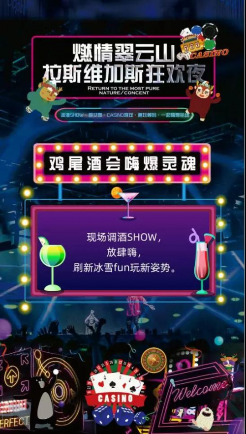 为了迎接元旦佳节,给新年带来一个良好的开端,并营造和谐的节日氛围,本次活动设置了精彩擂台,诚邀四海英豪,参与叱咤冰雪实力之争,简单易行的玩乐形式,疯狂刺激的惊喜彩头,将带给大家更多开心和快乐。翠云山拉斯维加斯之夜名流荟萃,共赴一场实力之约,活动环节全部经过精心设计,各种玩法精彩纷呈,名流之约等你来战,问天下谁是英雄,让我们拭目以待。