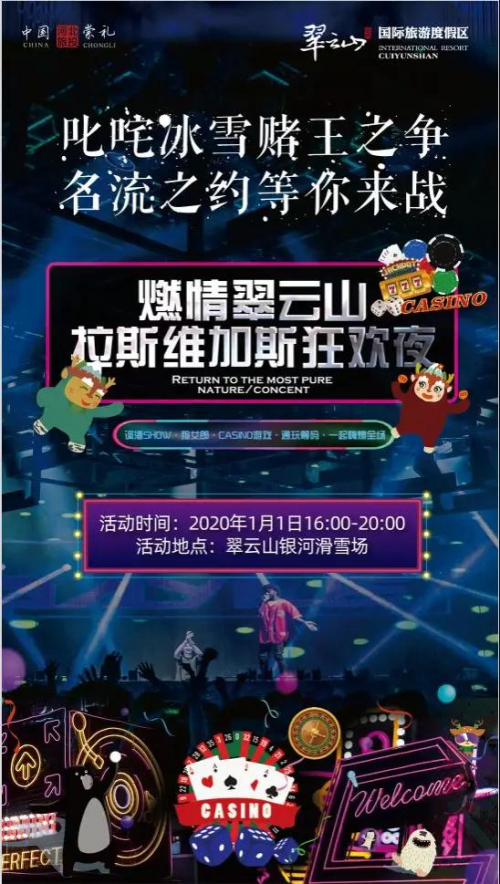 2020年1月1日,公历新年第一天,翠云山银河滑雪场各路英雄齐聚一堂,各种好戏轮番上演。“名流之约”燃情翠云山拉斯维加斯狂欢夜惊艳开场,无比高端的酒会、疯狂刺激的玩法、堆积成山的筹码......所有一切都只是这一夜疯狂的注脚,主角,就是你,要耍,立即来!