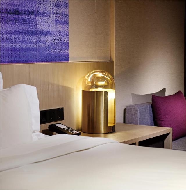 紫色调延续至客房空间,慵懒自在,是这里的关键词,不管是带有麗枫紫的地毯,还是木质材料打造的空间,或是飘窗处的软垫和舒适的大床,在客房的每个角落,都散发着温暖而又自在的气息。