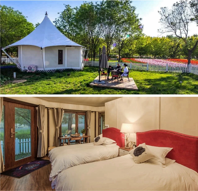 离北京最近的郊区——顺义,十二座以不同星座元素装饰的“星空帐篷”散落于鲜花港景区内,彼此之间的距离也是按照星相中的位置排列,可从中感受到自然、人、宇宙之间的和谐关系。每顶帐篷都有自己的独立私人院落,室内各种设施一应俱全,舒适的沙发,成套的实木桌椅和柜子,大床房,标间,多样的房型选择,各式贴心小物和电器,品质极佳不将就。