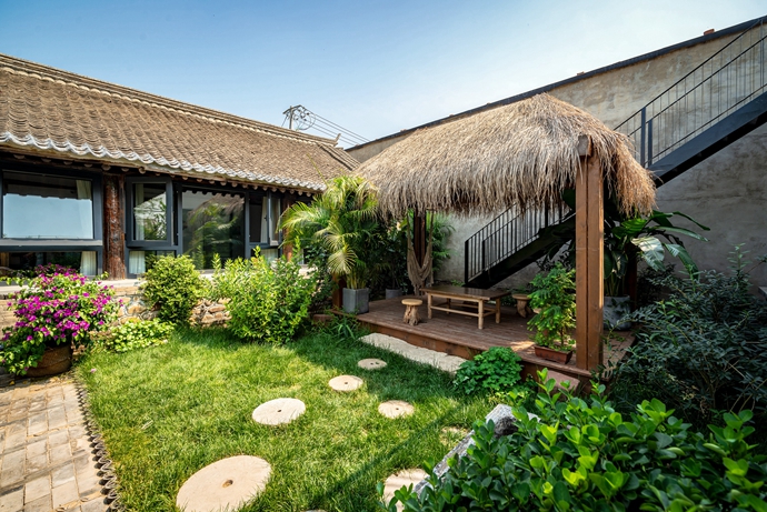 与“麻麻花的山坡”同在南峪村的“野望乡居”则是把秋景搬进了院儿里,紧挨一起的3个院落由中间宽敞的木质庭院相连。