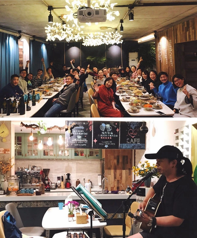 百余平的餐厅,可同时容纳40几人用餐,又兼具咖啡厅空间,沁人心脾呃咖啡香、精致拉花,偶尔兴起弹唱一两首轻歌小调,团建时还可供开会之用,功能十分强大。