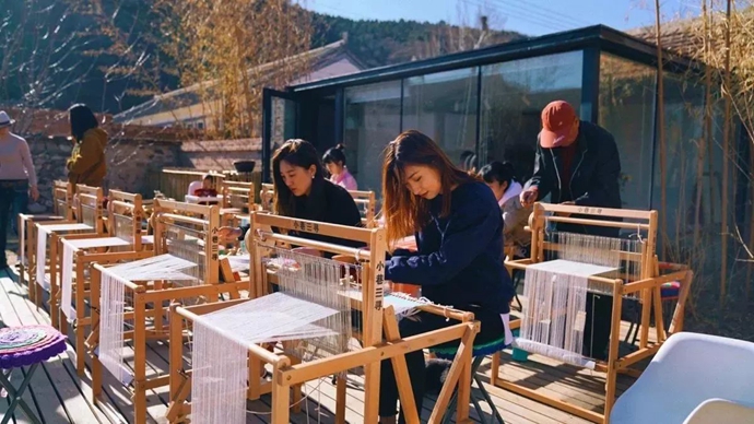 距“山楂小院”十五分钟车程小观头村的“先生的院子”里,还原了古法织布的原木纺车,吱呀呀开工啦,一丝一缕彩线在手间翻飞成漂亮的方巾、桌旗,满满成就感!