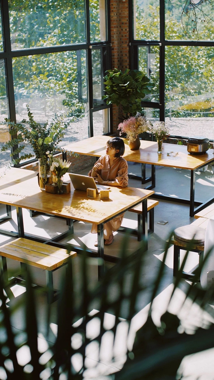 几何框架下的大玻璃将屋脊与蓝天切割开来,原木质地的家具,一棵真实树木砍来的改造的吊灯…阳光透过栗子林,不偏不倚地给每个角落都装满生机…看那树那花,看那桌那椅,看那梯那炉,盈盈满满。